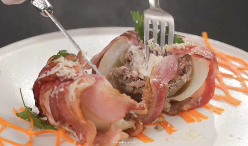 📢 취향에 따라 모짜렐라, 체다 등 다른 치즈도 활용 가능합니다. - 베이컨 3~4장으로 양파 겉면을 단단히 감쌉니다.