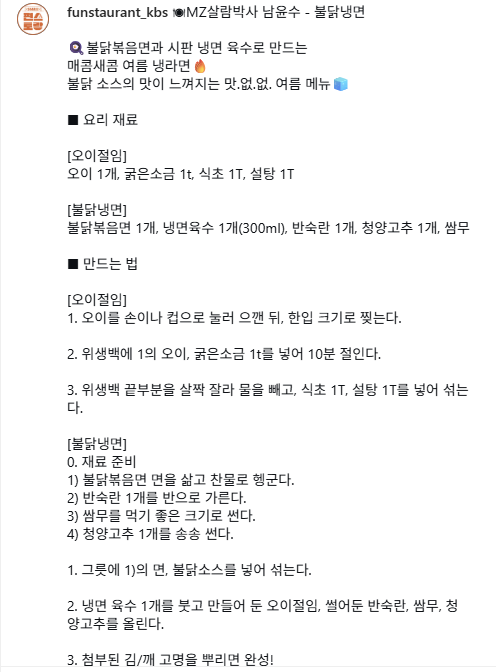 편스토랑에서 소개된 살람박사 남윤수의 불닭냉면 레시피를 정리했습니다. 불닭볶음면과 냉면 육수로 만드는 매콤새콤 여름 냉라면으로 집에서도 간단하게 따라 할 수 있는 공식 레시피입니다.