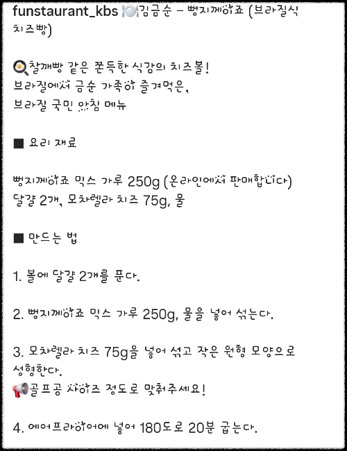 편스토랑 282회에서 소개된 브라질 국민 간식 ‘뻥지께이죠’ 레시피! 믹스 가루와 치즈로 간단하게 만드는 치즈빵. 영양소 정보까지 정리한 초간단 레시피 가이드.