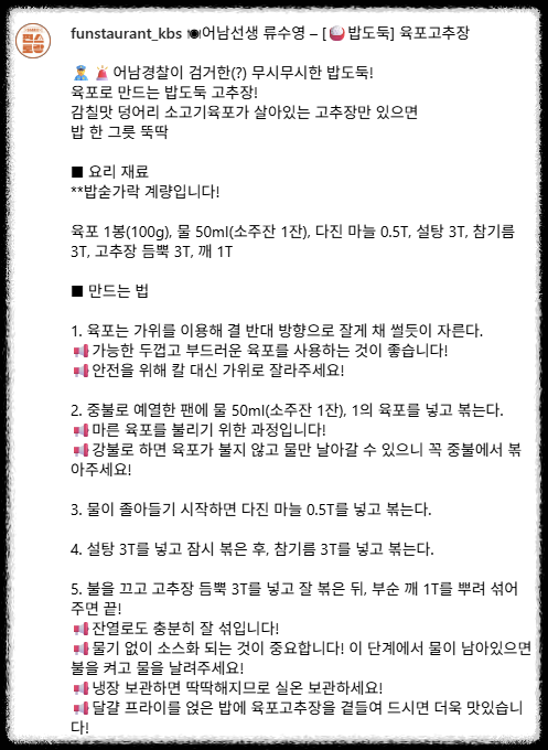 ✅ 오늘은 **편스토랑 류수영표 ‘육포고추장’**으로 든든하고 맛있는 한 끼 어떠신가요?