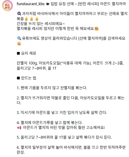 편스토랑 선예 아몬드 멸치까까 레시피를 정리했습니다. 간장 없이 만드는 바삭한 멸치볶음, 아이들 반찬으로 좋은 고소한 멸치까까 만드는 법을 단계별로 안내합니다.