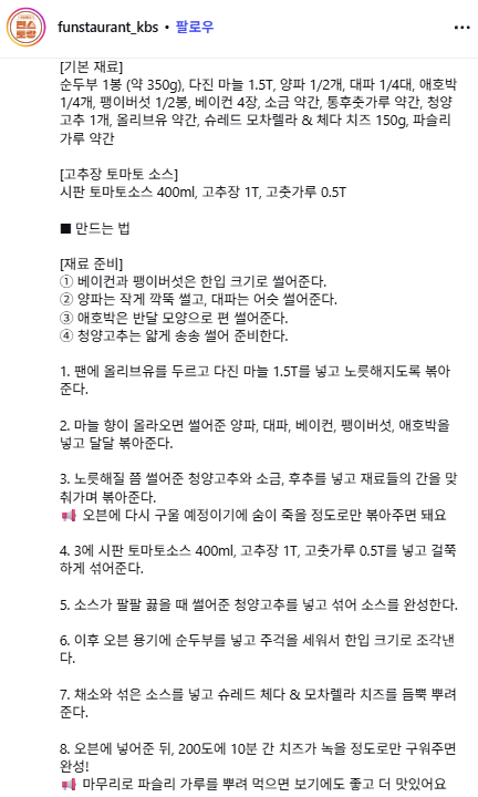 🍳 순두부의 부드러움과 치즈의 고소함, 매콤한 고추장 토마토 소스까지 더해진 중독성 강한 한 끼 메뉴입니다.