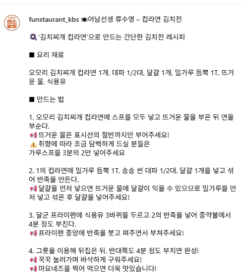 편스토랑 방송에서 류수영 님이 직접 선보인 컵라면 김치전 레시피입니다.